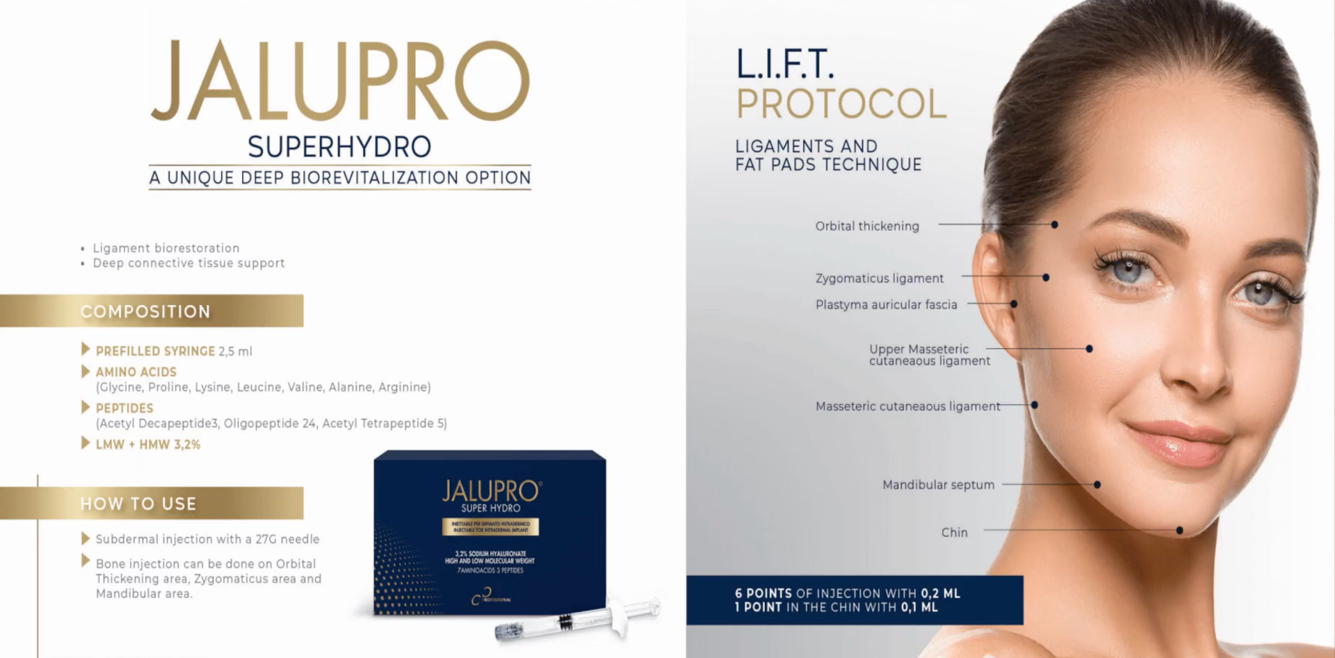 Je pokročilý injekčný "skinbooster" švajčiarskej receptúry ocenenej na IMCAS v Parížo ako TOP inovatívny produkt roku 2023. Tento prémiový zákrok je ideálny pre klientov, ktorí hľadajú efektívne riešenie na dehydratovanú, unavenú pleť so stratou elasticity a pevnosti. Jalupro SuperHydro ponúka výsledky, ktoré sú nielen viditeľné, ale aj dlhodobé. Aplikuje sa hlboko k ligamentám.